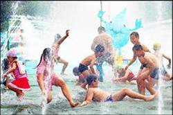 超大水床加噴水柱,讓小朋友屢屢跌倒,卻仍覺得好玩。
