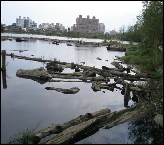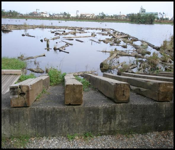 鐵道旁斜斜的平台,就是針對檜木從火車上要下去貯木池而設計的卸木台,前方這一大片生機盎然的池塘,原本是存放木材的地方!因為當時檜木是最高貴的木材,從太平山運送上好檜木到達這裡後,為了避免被太陽曬裂,因此就挖個大池塘來存放。